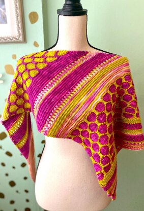 Final shawl measurement is flexible, sample is 30” at its widest end by 52” long tip-to-tip but other testers blocked to their preference (from 34” by 52” up to 22” by 60.“) So, feel free to customize, but blocking instructions for size shown in sample are included.