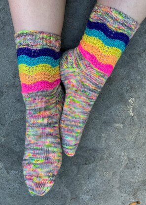 Undulating waves of colour blocked lace make for eye- catching legs! But whilst these waves look mighty impressive, the lace is simple enough that this makes for a relaxing knit. Zoom zoom zoom through the vanilla foot and before you know it you’ll have a brand new pair of socks. Go for a fade, a bright rainbow or more muted tones, the choice is all yours! This pattern is worked in the round from the cuff down. Knit from the top down, with a heel flap and gusset construction, the foot can de knit to any desired length.
