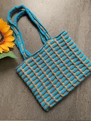 The pattern is made up of knit, purl and slip stitches and knitted as two flat sides and then sewn at the edges. The handles are knitted in the same pattern but swapping the colours around.