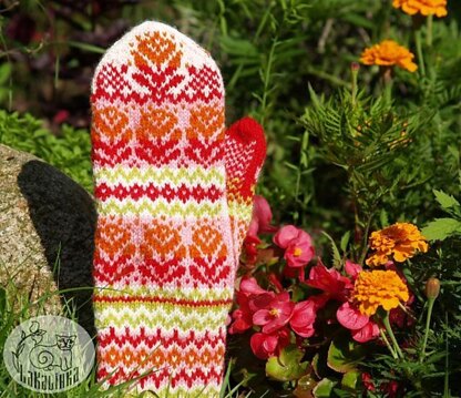 **Design details:**● stranded colorwork mittens with bobble edging ● knitted in five colors ● worked in the round on DPNs ● thumb with thumb gusset ● available in two sizes ● the mitten pattern is symmetrical for each hand