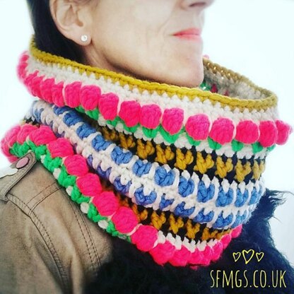 Crochet pattern to make this 'Bloom Bunny' scandi-style, quirky and kitsch, tulip and heart motif cosy crocheted cowl using a variety of fun textured crochet stitches!