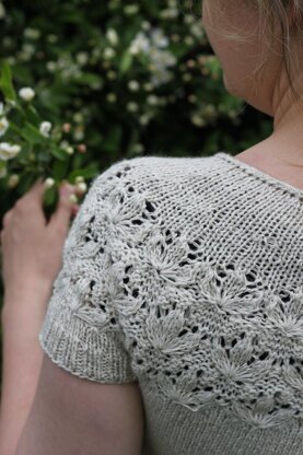 The lace yoke is worked bottom up from a provisional cast on, in order to make the flower lace turn the right way. Decreases are built in to the lace pattern and the stockinette stitch area above, and the neckline is finished with an i-cord bind off. The provisionally cast on sts are then picked up again, and the rest of the top is worked top down for the body and sleeve trim.