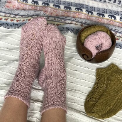 These socks feature an elegant eyelet lace design, and are perfect for sunny summer days! The ultra-customizable pattern includes instructions for both a picot edge cuff and traditional ribbed cuff. It also includes two heel options and instructions for both mid-calf and shorty length.
