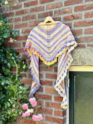 Bloomon is a topdown triangular shawl featuring a simple yet beautiful shawl body and an intriguing border made of crochet shells.