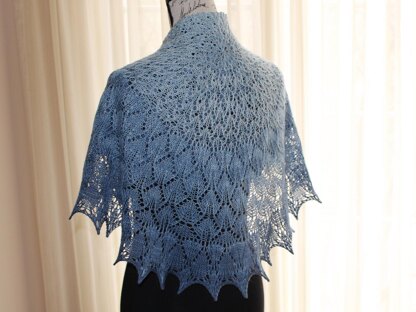 Delicate lace motifs at the center grow and become more leaf-like as they expand toward the edge of the shawl. Shown in a gradient yarn, either pattern shows equally well in a solid or semi-solid colorway.