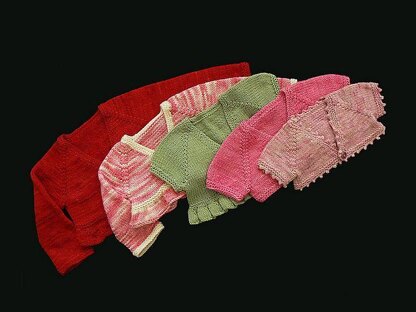There are 5 different edging finishes available for this pattern; plain garter stitch edge, garter with picot edge, garter with a bell pleat ruffle, garter with a plain ruffle and garter with a lace ruffle. Four sleeve options are available; cap sleeves, flutter sleeves, tapered 3/4 sleeves and tapered long sleeve.
