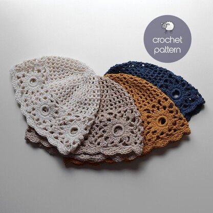 Blossom Spring Hat, Hippie / Boho style, made of cotton yarn, perfect for spring/summer season. To make the kerchief you will need: * yarn: 1 skein of sports 5 ply cotton yarn, (yarn used Drops Love You 6 from Drops GarnStudio) * crochet hook: 4 mm or 4.5 mm * scissors * tapestry needle or small crochet hook size 2 - 3 mm to wave in the ends Pattern is written in US standard terms. Skill level - Easy. Sizes: Teen/S and M/L