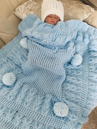 *BLUE BAMBINO* knitting pattern is PDF ONLY. Finished size is approx 36x36ins/92x92cms You will need approx 400gms of baby soft double knit yarn or equivalent and 1xpair 5mm knitting needles. A centre square is knitted first and the sides are added by picking up stitches from one side at a time. Nothing hard. I feel this design is perfect for girls and boys just adjust the colour accordingly. The pom poms are optional. Just like all my patterns *BLUE BAMBINO* comes as a pdf ONLY. PLEASE, PLEASE DO NOT ASK ME FOR A PAPER, POSTED PATTERN AS THE ANSWER WILL ALWAYS BE A POLITE NO.