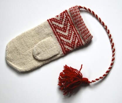 Besides small scale reindeer herding, the Skolt Sami traditionally practice sea fishing and netting river salmon. This Skolt Sámi traditional pattern, Boat's Bow, has the deep, sideways “V” like the prow of a boat. Boat's Bow is a characteristic Skolt Sámi mitten: it has an open, patterned cuff with multi-row slyngborden border. The pattern is worked every other stitch; it has a plain hand, peasant thumb with cupped tips and is finished with a braid and tassel.