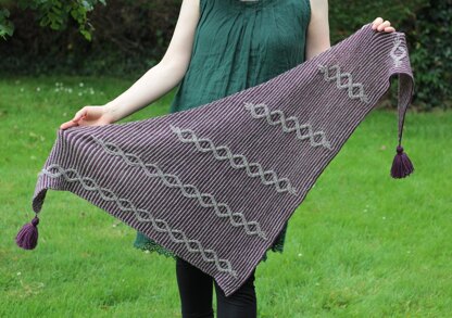 Bobailín ('BobaLEEN', the Irish for tassel) is a two-coloured shawl featuring slipped stitch ribbed cables worked over a striped garter stitch background. The pattern is worked in two colours, beginning with just a few stitches, and increasing the stitch count as you work garter stitch stripes. Ribbed cable motifs are introduced as the pattern is worked. Only one colour is worked per row, and the cable stitches are slipped when working contrast colour rows. The pattern is ended with garter stitch stripes, and finished off with two fabulous tassels.