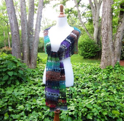 Bobbe's Summer Scarf is worked with a single skein of self-striping yarn. It's light enough to be worn on the warmest days, but substantial enough to keep off the chill when you step inside.