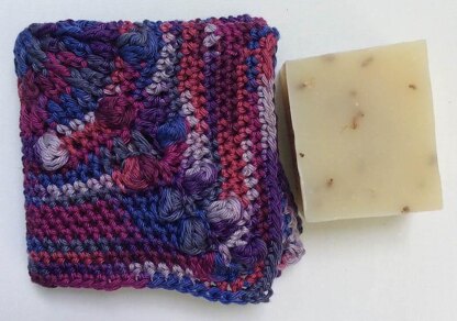 This washcloth combines post stitches and bobbles to create a gentle, exfoliating texture.