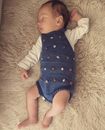 The BobbleRomper is a versatile and adorable garment designed for children, from newborns to 4 years old. It has cute bobbles that make it special. It is perfect for adding a touch of elegance to any outfit. This piece can be adjusted in length both at the shoulders and at the crotch, allowing for a comfortable fit with adjusting length as they grow.