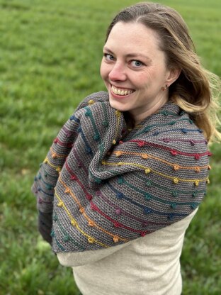 Bobble Wrap is a large wrap/scarf in garter stitch and stripes of bobbles bringing interest to the garment. Bobble Wrap is created for two 100g skeins and 7x10g mini skeins of 4-ply yarn. The finished shawl is a cosy wrap or wide scarf, bespeckled with bobbles like jewels. Knitted diagonally, extra length is gained from the pointy ends.