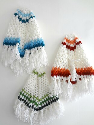 The tutorial guides you in making these adorable bohemian baby shawls. They are for 0-3 months old babies. When overgrown they can be worn as a scarf or a bandana.