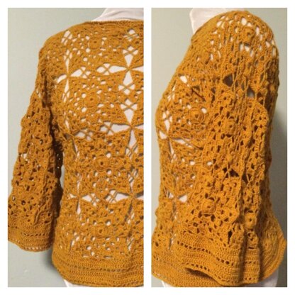 The pattern is written as a ‘one-size-fits most’ pattern. Best suited for sizes M-XL. To increase the overall size of the garment additional rounds can be added to each motif before joining. Or, a larger hook and thicker yarn can be used to increase the overall size of each motif. You can also add an extra column of motifs to the front and back center of the garment to increase the overall size as needed.