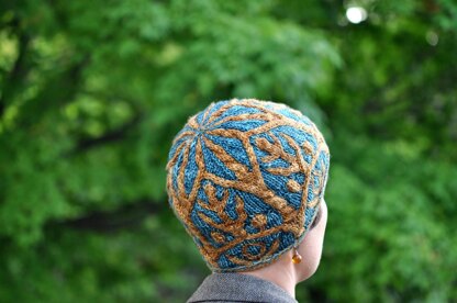 The twisted trees and golden leaves of this hat are inspired both by the golden woods of Tolkien’s Lothlorien and the floral motifs of the Art Nouveau movement at the turn of the 20th century. This hat makes use of cables and stranded colorwork at the same time to bring out the twining trunks and branches, and leaves are shaped using increases and decreases to give them smooth lines.
