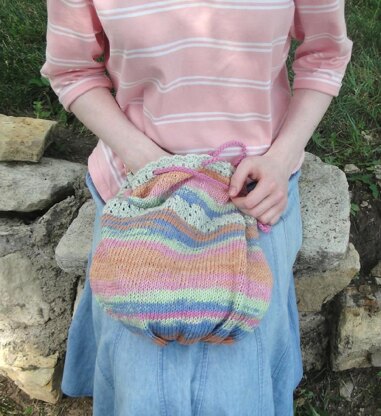 Bonnie, the fun and cheerful knit bag! Cute lace details and instructions for a full lining. Several photos help with putting the lining into place.