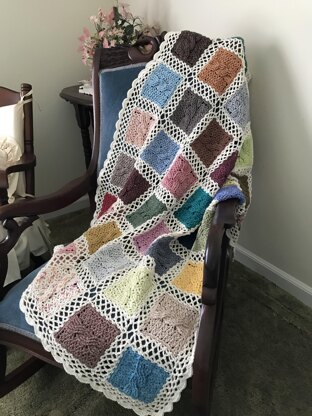- For the yarn, you will need 9 skeins (colors can vary on these skeins) for the squares, and 5 skeins for joining them & for the trim.