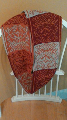 The color pattern for this cowl is adapted from the “bouquet” design used in Persian rugs. The cowl has a narrow garter stitch border to provide finish to the edges.