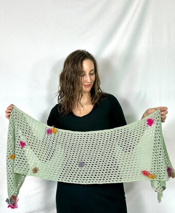 “Bouquet” is an open lace shawl knitted with Hobbii Friends Cotton Silk and removable flowers knitted holding 2 strands of Diablo mohair blend. The flowers can be rearranged depending on your outfit or mood for infinite ways to style this piece.