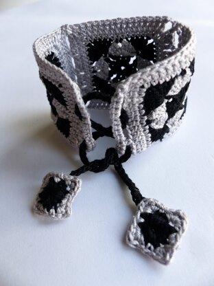 A bracelet made up of several "Granny" squares, the number of which may vary according to the size of the yarn used. It can be made into a rather classic bracelet with sober colours or a more colourful piece of jewellery with bright colours. The proposed attachment system does not contain any metal or plastic parts that could injure the skin or cause allergies. It also allows the bracelet to be adapted to all wrist sizes. The realization of the bracelet is quite easy, it is the regularity of the work that is the most important. The PDF tutorial includes a main diagram and 2 detailed diagram as well as a step-by-step explanation with 17 photos.