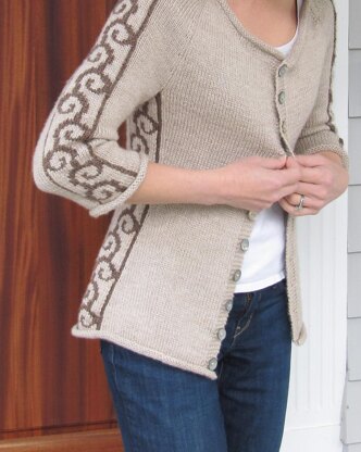 Because the stranded motif is oriented vertically, a combination of stranded and intarsia knitting is used: along the side edges of the stranded panels, the main and contrast color yarns are twisted around each other to prevent holes. Since the stranded scrolls are so eye-catching, the rest of the cardigan is styled simply, with a wide, shallow neck, moderate waist shaping, slightly below-the-hip length, and 3/4-length sleeves.
