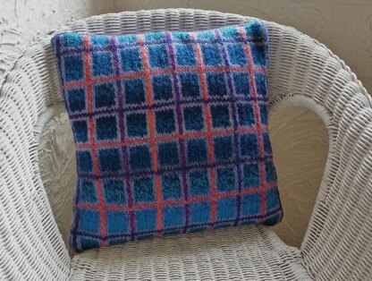 The Breacan cushion cover is a slightly less formal take on the familiar tartan pattern, designed to fit a standard 41cm square cushion pad. It is knitted in four shades of chunky, self-patterning yarn, making it a quick but satisfyingly pleasing knit. The subtle colour-changing background reminds me of a beautiful, shifting night sky viewed through a window.