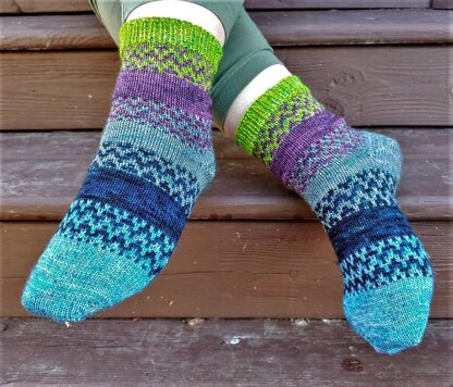 Breakwater Socks, my first collaboration with Brine Dyeworks, are a striped mosaic colour work sock.