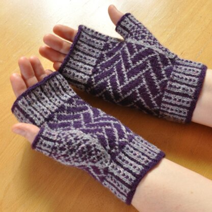 Knitted in the round, these Brickazag Mitts have thumb gussets and corrugated ribs with lice for extra interest. Instructions for left and right mitts are identical; the stripe above and below the thumb prevents a pattern jog at the beginning of the round.