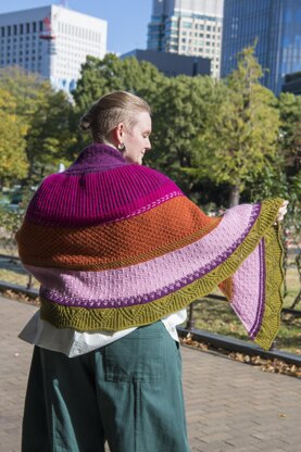 This is a semi circular shawl with an extended wingspan to engulf yourself in and be comfortable. Wrapped around your shoulders, two colour brioche will give you extra warmth with its lush texture. The lace border gives it an intricate finish and can easily be blocked into a scalloped edge or kept in a round shape.