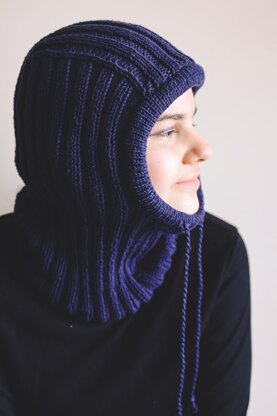 The neck part is knit in the round, the hat part is knit flat. The face opening binding / drawstring tunnel is knit in the round.