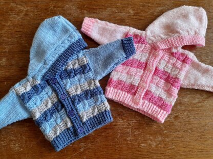 Baby hoodie, age 0-3 months, 14-16" chest. Knitted in one piece to armhole in a striped, broken cable design with cable detail on sleeves and edge of hood. Suitable for boy or girl.
