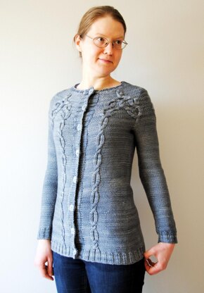Brontide is a top-down cabled cardigan inspired by earthquakes and seismic events. The cardigan is worked in one piece from the top down. Short-row shaping is used to create a rounded neckline. Waist and back shaping give this hip-length cardigan a flattering hourglass shape. The reverse stockinette sleeves are also worked seamlessly. Stitches are then picked up for the ribbed button bands. Knitted in plump, worsted-weight yarn, the cables truly pop up out of the reverse stockinette background.