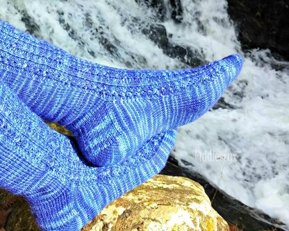 The lace pattern on these socks creates small circles which, combined with the variegated blues of the yarn, remind me of the swirls and eddies of a babbling brook.