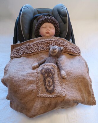 Brown Bear 3-12 months Car Seat Blanket with Hat and Toy. A unique design for a very special baby and a perfect baby shower gift that will delight any new mother- to-be. The blanket will keep the baby snug with the added benefit that it stays in place and does not slip or ride up as it is secured by the lower straps without interference. A feature pocket is useful for carrying a dummy or soft small toy bear.