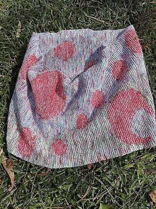I used two lace weight threads held together to get the color changes in the sample - a white cotton, two multicolor rayons, and a red acrylic. Sadly, I think they're all discontinued. I'd suggest three skeins of fingering weight yarn (400 yds / 365 m each) for a cowl. If you want to do a long scarf by adding a repeat, you'll need a second skein of the main color. I'd recommend 8 stitch markers.