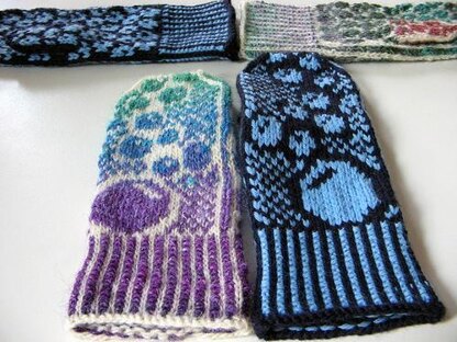 Add a bit of whimsy to your winter with these playful mittens. Knit in a modified Norwegian style with afterthought thumbs, these stranded mittens feature 2-color single ribbing on the cuffs and a rising bubble design that is mirrored on the left and right hands. The pattern comes in two sizes, dk and worsted, and should fit most adult women. Use two high contrasting colors to make the design pop.