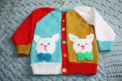Bunnies on Parade is a crew neck, raglan sleeved cardigan that is knit in color block style. Two adorable bunnies double as pockets and add pizazz to this cardigan. Knit mainly in rib knit and stocking stitch, the pattern is an easy knit and it is the multitude of bright colors that bring a smile to any young gentleman who wears it. I worked this design in Schachenmayr Bravo yarn and have written the pattern in four sizes, 6 months, 12 months, 18 months and 2 years. The one in the photo is size 18 months and required almost a full four balls of yarn. This yarn is available in 50g skeins and there was only a small amount of each color left when the cardigan was complete. Six snappy buttons add to the flair and color as well. Easy to make and a hit with the younger set.. what are you waiting for? Use any DK yarn and make your favourite little man his own Bunnies on Parade cardigan for the summer.