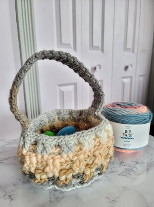 This easy intermediate pattern features a classic basketweave design and bulky weight yarn to create a structured yet flexible and soft basket. Featured yarn is Big Twist Arcade in colorways Natural White Multi and Pink Blue Multi. You'll need approximately 150 yards of a bulky [5] weight yarn in the fiber of your choice to make a finished piece that's 10" wide across (25" in circumference), 4" tall basket (12" tall when held by the handle), and a handle that's 16.5" long. You'll also need a US-K 10.5/6.50mm crochet hook, tapestry needle, and scissors.