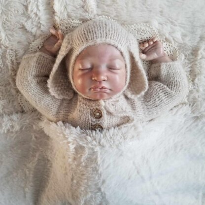 This pattern is well-suited to an intermediate knitter. Must be able to knit in the round. Includes instructions to knit a newborn bunny bonnet and romper with long sleeves, as well as a sleeveless romper.