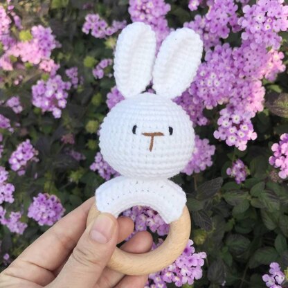 Perfect for crochet stuffed animals patterns, this bunny rattle combines soft yarn with a wooden teething ring. It’s a fun project for those exploring crochet teething ring patterns and an adorable addition to any baby’s playtime.