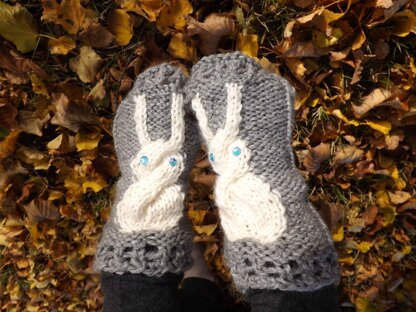 The pattern is made for at yarn with a gauge of 18 stitches per 10 centimeters (stockinette stitch) - i.e. a yarn with a yardage of approximately 80 meters per 50 grams. The pattern includes directions for making a contrast colored intarsia cabled bunny and one pair with a cabled bunny with a tail. Both pairs are shown in the pictures.