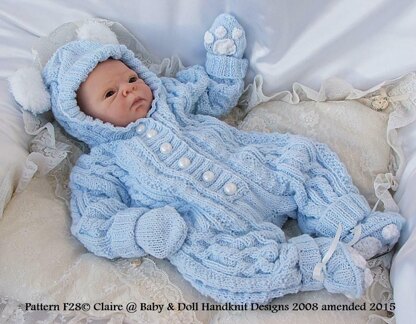 Knitting pattern for a cosy cabled all in one with hood and either bunny or teddy ears. Also has bootees and mittens with little paw prints.
