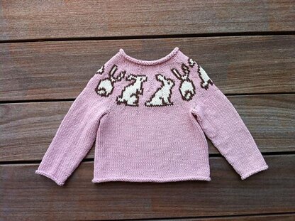 I created this pattern in honor of the Chinese Year of the Rabbit; this pullover would also be perfect for Easter. The bunnies require some attention on the part of the knitter, but the remainder of the pullover is worked in the round in simple stockinette, and will go quickly. Worked in the round from the bottom up.