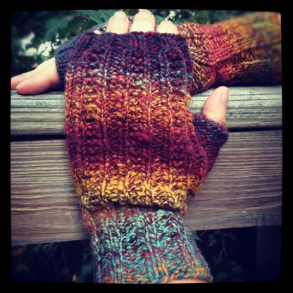 This is a quick and simple pattern for worsted weight fingerless mitts suitable for beginning knitters. It was inspired by the Bus Hat, designed by Kylie McDonnell-Wade. The Bus Hat is the perfect pattern for handspun - simple, but with just enough interest created by the garter patterned stripes to keep it fun. I loved the hat so much, I wanted mitts to match it. This pattern has not been tested, and has only been knit in my handspun, which is why the yardage given is such a broad range. Please contact me if you find errata. Enjoy!