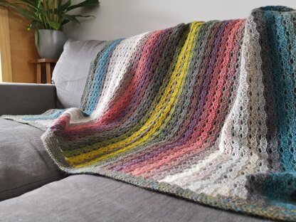 Bushel makes use of all 20 colours of 25g mini skeins and you can choose from a lap blanket size or a throw that is large enough to fit the bottom of a double bed.