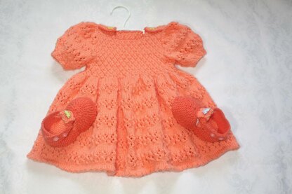 Butterflies and Lace Baby Dress and Matching Shoes: This design is a FULL skirted dress with puffy balloon sleeves. The skirt is edged with picot stitch and light and breezy in a lace design. The bodice is worked in Seersucker stitch and the sleeves are designed to match the lace skirt. The shoulders are closed with Butterfly Buttons to add ease of dressing. The shoe soles are worked in moss stitch - doubled with plastic canvas for stability between them. The toes are short rows and the heels and strap are moss st. They fit a 9-12 month old with 5.5" soles. This is an intermediate knit and takes about 2.5 50g balls of baby yarn for the main colour and 1/2 a 50g ball for the shoes and edging of the second colour.