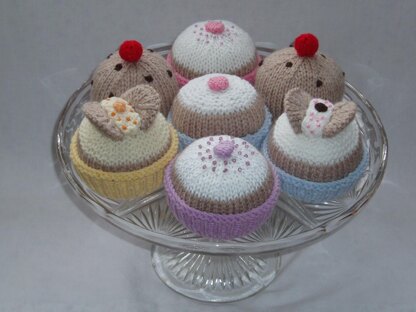The cakes and buns are made from the same easy pattern. The cakes/buns, cakes cases and toppings are all knitted separately with a hand sewn seam.