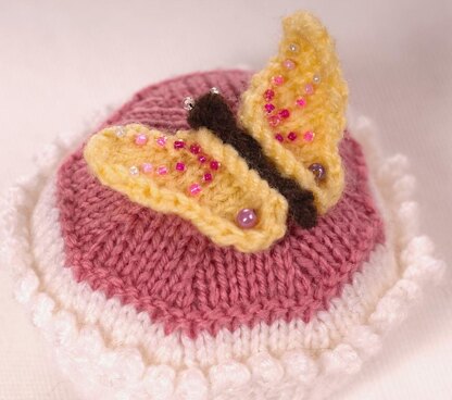 Here is a butterfly cake which really looks like a butterfly! It is made in one piece from the bottom upwards, so there is only one seam to work at the end. You will need to use 3 double pins for a few rows, starting from the 7th row. You will also need to pick up and knit a picot edge. The butterfly is worked separately and sewn on with bead decorations.